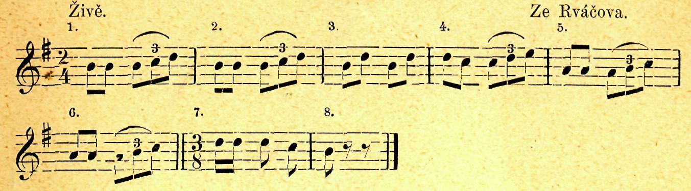(1.—4.) Polka. Stanou a, proti sobě stojíce, tleskají při taktech (5.—6.) čtyřikrát buď levou dlaní o levou a pravou dlaní o pravou dlaň, tedy křížem, nebo tleská tanečník pravou rukou v levou ruku tanečnice, kteráž při tleskání couvá před