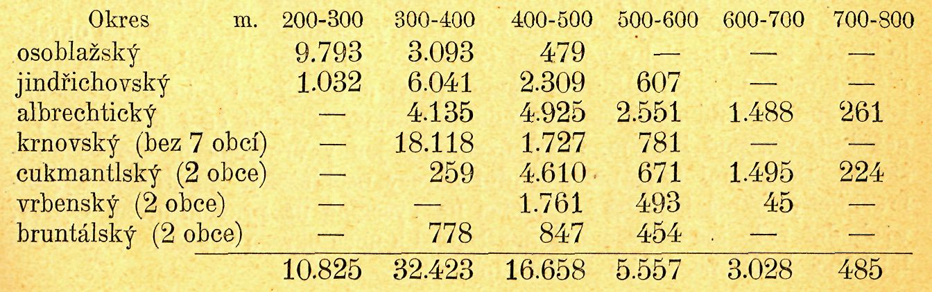 Úrodný okres osoblažský se 106 ob. na 1 km.2 a hornatější jin-dřichovský se 108 ob. na 1 km.2 zabývají se skoro výhradně zemědělstvím a jeho průmyslem zde dosti slabým. Zemědělský ráz Osoblažská jeví se jíž ve velikosti tamějších obcí; ze 23 jenom 2 mají více než 1000 ob., za to 17 méně než 500 ob. Zde leží též nejmenší slezská místní obec Pískořov (121 ob. ve výši 410 m.). Obyvatelstvo obou okresů soustřeďuje se hlavně v údolí řeky Osoblahy, zvláště v okrese jindřichov-ském (5 obcí z 8), v němž i údolí Opavice zaujato je velkou obcí Tře-mešnou (2273 ob.). V údolích těch bydlí v okresu jindřichovském 10/11 všeho obyvatelstva.