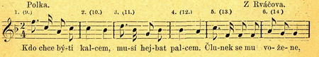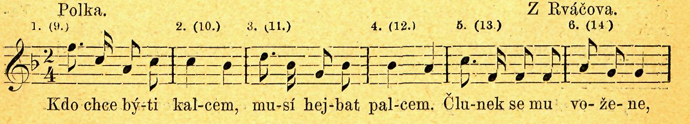 (1.—-8.) Přetančivše obyčejnou polku dokola, stanou a za ruce křížem se vezmouce, tančí (9—16.) řezanku.-Tanec se znova opakuje.