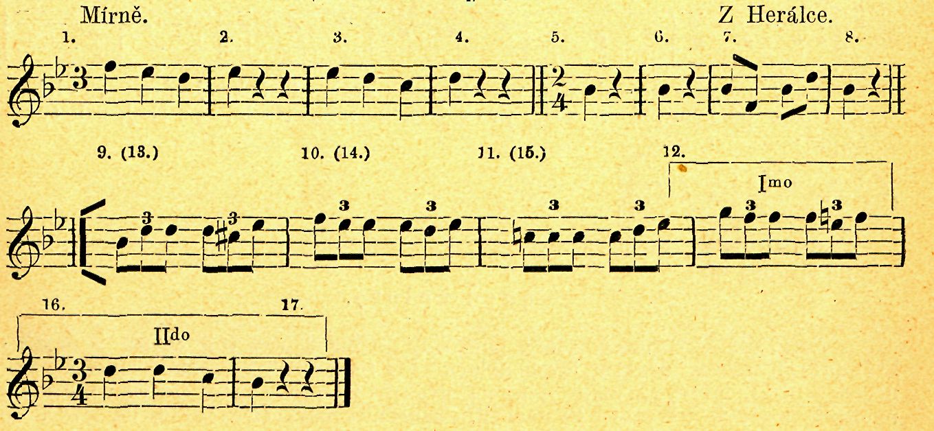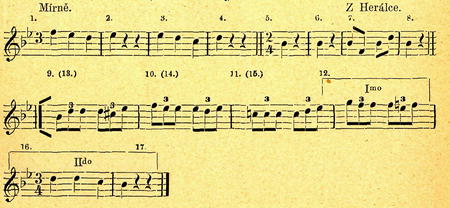 (2.—5.) Tančí se valčík, jejž začíná tanečník šoupavým sunem pravé nohy k levé noze. (6.) — (1.) (7.—9.) zase valčík. (10.) Oba tančící ukročí levou nohou, majíce pravé nohy skrčeny, a třikráte potřesou na nich, pak (11.) totéž opětuje se pravou nohou. (12.—13.) valčík. (14.—15.) -= (10.—11) (16.—17.) valčík. Tanec se opakuje.