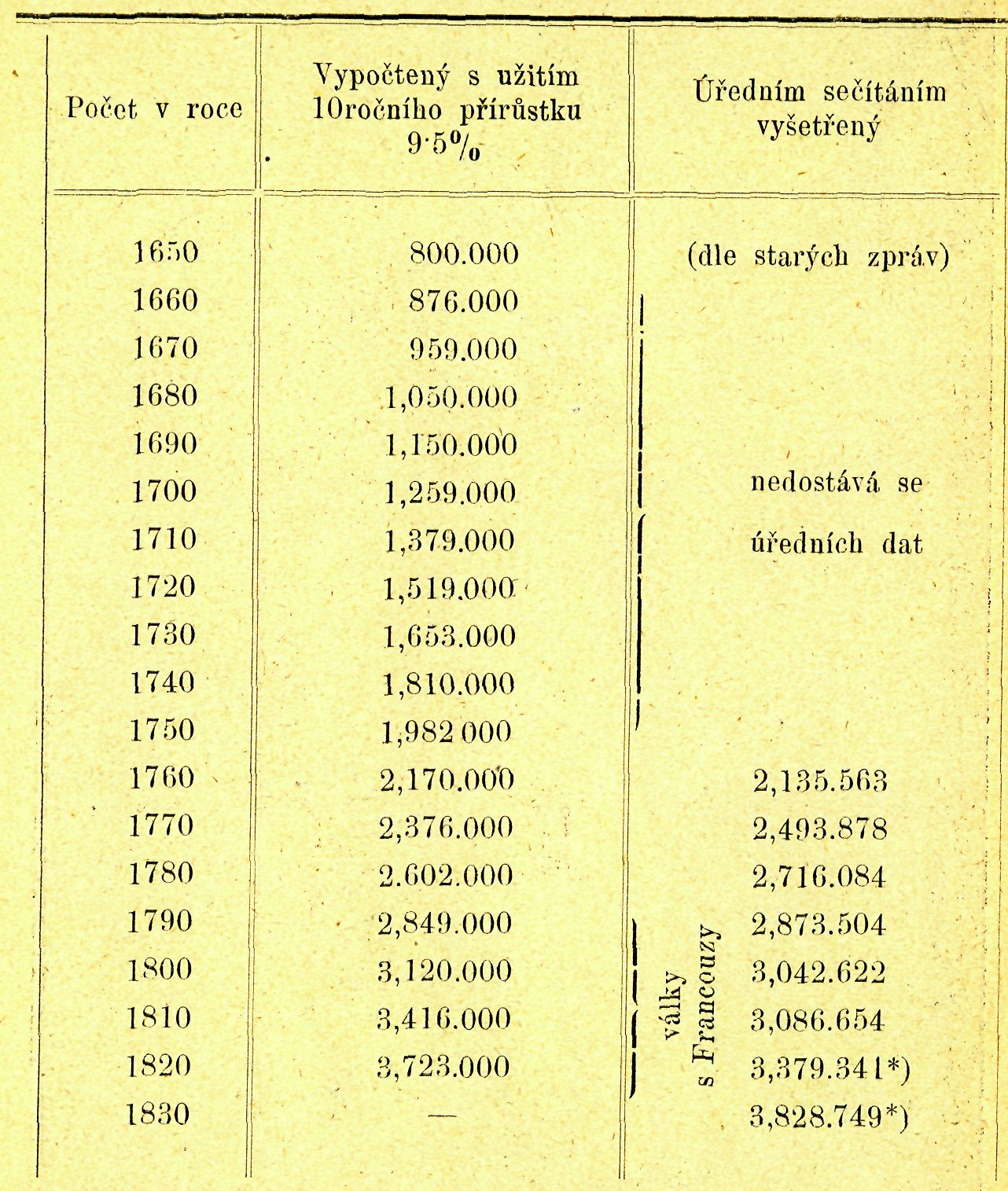 *) Skutečný přírůstek po ukončení válek za 10 let 13.3%.