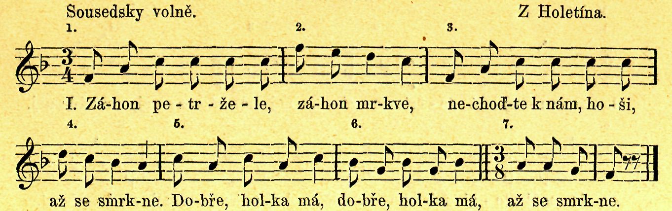 II. Záhon petržele, záhon mrkve, záhon mrkve, záhon mrkve, nechoďte k nám, hoši, až se smrkne, až se smrkne, až se smrkne, tramtadatada, tramtadatada, až se smrkne.