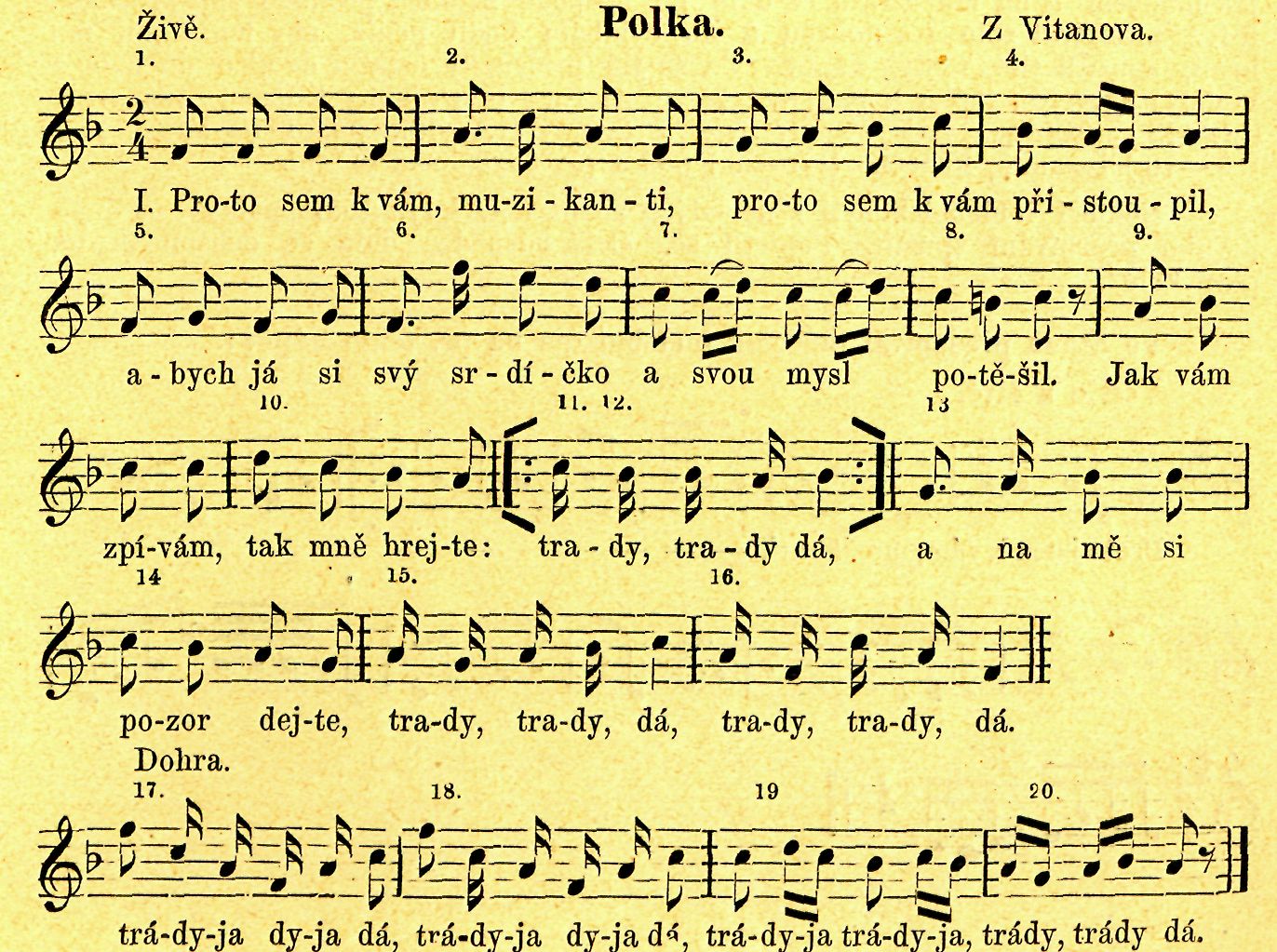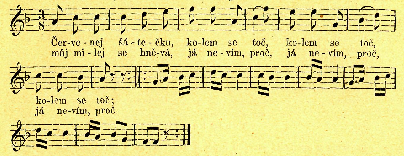 levicí svou si přidrží pravici tanečnice, tleskne třikrát svou pravicí na dlaň tanečnice. V taktu 6. tanečnice pravicí svou si přidrží levici tanečníkovu, tleskne třikrát svou levicí na dlaň tanečníkovu. V taktu 7. a 8. otočí se oba v levo.