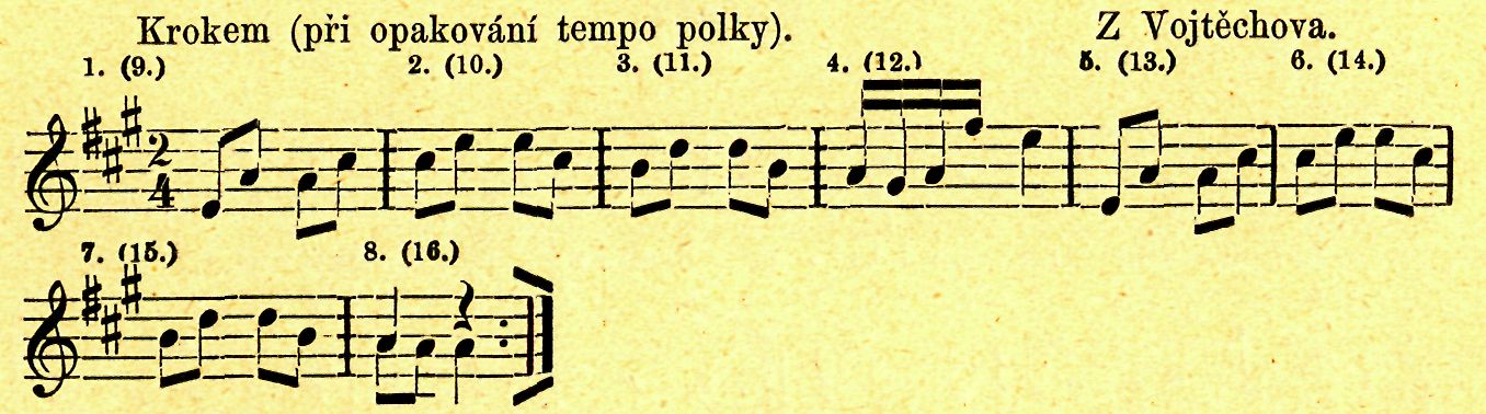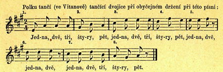 Tancují týž tanec tak, že v 1.—6. taktu tančí polku, v 7. a 8. taktu následuje otoč obkročákový.