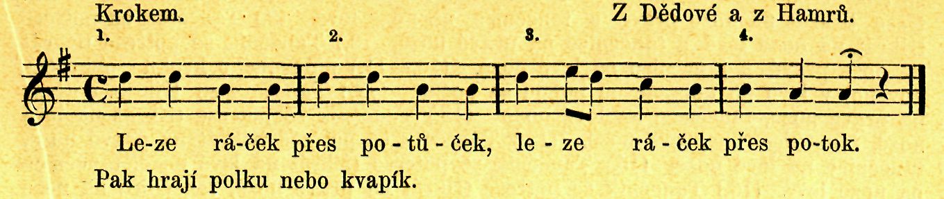 Tanečník se postaví před tanečnici tváří v tvář a drže ji za obě ruce (1.—4.) zpívá a kráčí 8 kroků zpět. Tanečnice postupuje v před, ženouc jej před sebou, načež muzikanti hrají obyčejné kvapík nebo polku, při čemž všechny dvojice, obyčejně se držíce a zpět se točíce, tančí do kola. Po té zazpívají všichni tančící „Ráčka", hudebníci hned vpadnou a dvojice tančí dále uvedeným pořadem.