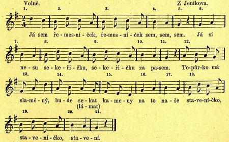 Dvojice se postaví v řadě proti sobě a podá si ruce. (1.—8.) Tanečník postupuje osmi kroky v před a žene tanečnici před sebou osmi kroky na zad, pak (9.—16.) ustupuje osm kroků zpět na zad před svou tanečnicí, jež postupuje osm kroků proti němu. (17__24.) při obyčejném držení tančí rychle polku do kola.