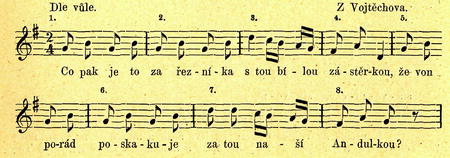 nečník se třikrát potřese na levé noze a tanečnice na pravé noze. (4.—5.) půldruhého kroku (obkročákového) v levo do kola, pravou nohou se počne. (6.) Tanečník se třikrát potřese na noze levé a tanečnice na pravé noze. (7.) Tanečník se potřese třikrát na noze pravé a tanečnice na noze levé. (8.) Tanečník se potřese třikrát na noze levé a tanečnice na pravé noze. (9.) Tanečník se potřese'třikrát na noze pravé a tanečnice na levé noze. (10.^-11.) půldruhého kroku (obkročá-kového) v levo do kola, levou nohou se počne. (12.) Tanečník se třikrát potřes^ na pravé noze, tanečnice na levé noze. (13.) Tanečník se potřese třikrát na levé noze, tanečnice na pravé noze. (14.) Tanečník se potřese třikrát na pravé noze, tanečnice na levé noze. (15.) Tanečník se potřese třikrát na levé noze, tanečnice na noze levé. (16.) Tanečník se potřese třikrát na pravé noze, tanečnice na noze levé. (17.) Tanečník se třikrát potřese na levé noze, tanečnice na noze pravé. (18.) Tanečník se potřese třikrát na pravé noze, tanečnice na noze levé. (19.) Tanečník se třikrát potřese na levé noze, tanečnice na noze pravé. (20.) půldruhého kroku (obkročákového) v levo do kola, pravou nohou se počne. Tanec znova.