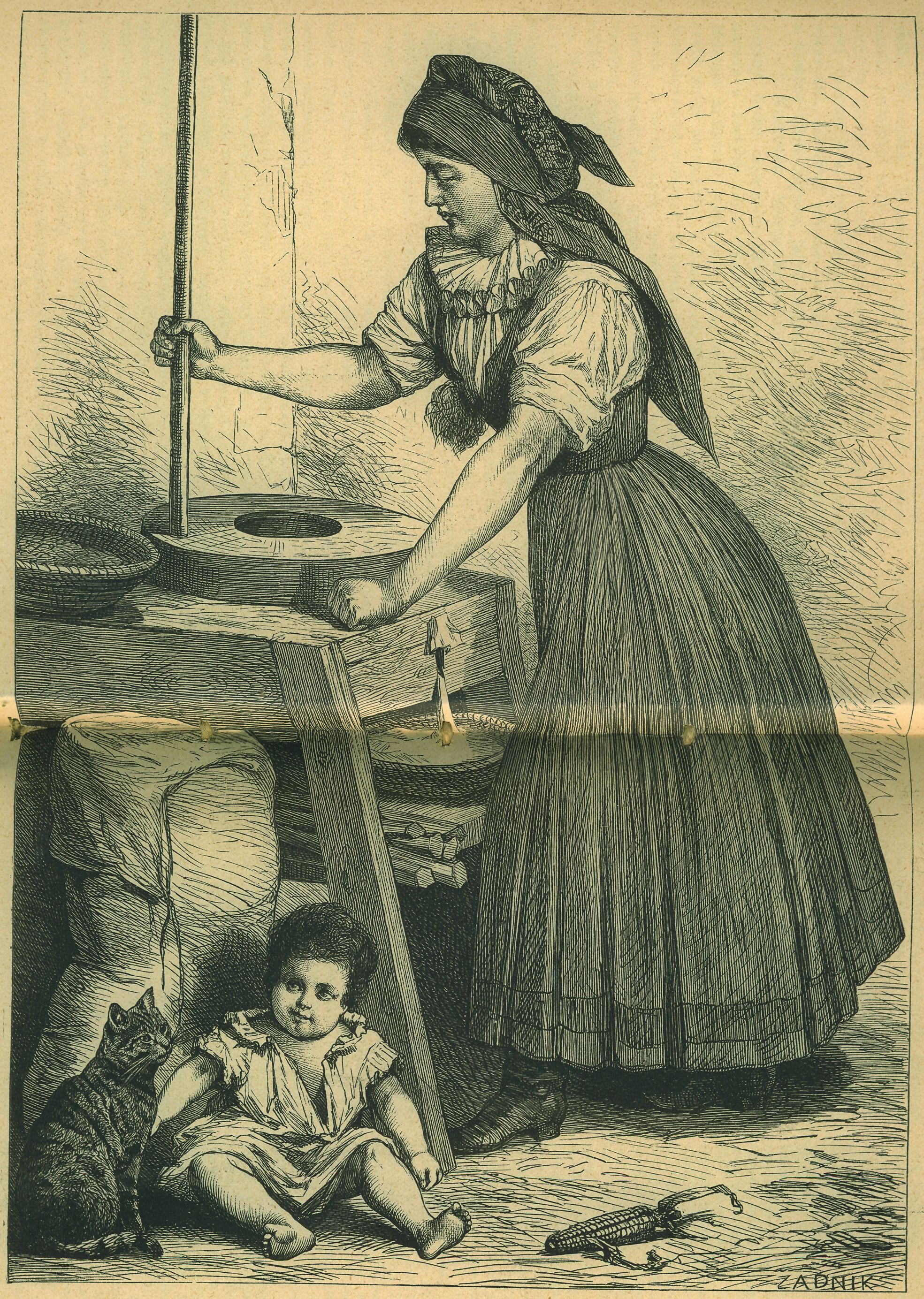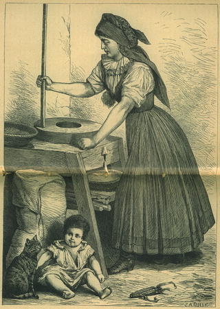 Slováčka při ručním mlýnku. Dle skutečnosti kreslil KAREL ŽÁDNÍK.