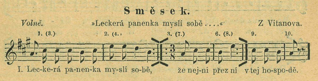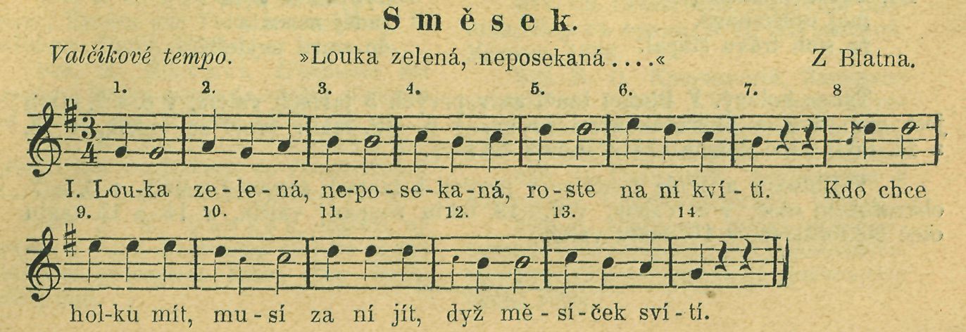 Při další písni (1.—4.) tanečník vezme dívku levou paží ohnutou za ohnutou levici a otočí se s ní polkovým krokem. Pustiv ji, podá pravou páži tanečnici na pravé straně a od (5.-8.) otočí se s ní opět v opačném směru, takže opíšou osmičku. Tentýž pořad pohybu jest při II. sloce. Opakuje se pak směsek od začátku. . :