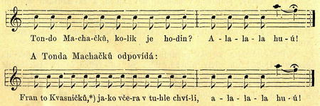Se stráně na stráň, kam roklemi a úžlabími byla cesta daleká, dorozumívali se skotáci hravě. Kozmlouvali zpívajíce a každá otázka i odpověď končila zavýsknutím: alalala huú!