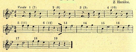 Tanec kolový. Dvojice tančící tančí při obyčejném držení 1.—2. čtyry přísunné kroky v pravo (tanečnice opačně), 3.—4. čtyry přísunné kroky v levo (tanečnice opařně), 5.-6. obyčejný valčík do kola, 7.-8.«¦» 1.—2., 9. 10. = 3.—4., 11.—12. = 5.—6., 13.^19. valčík do kola.