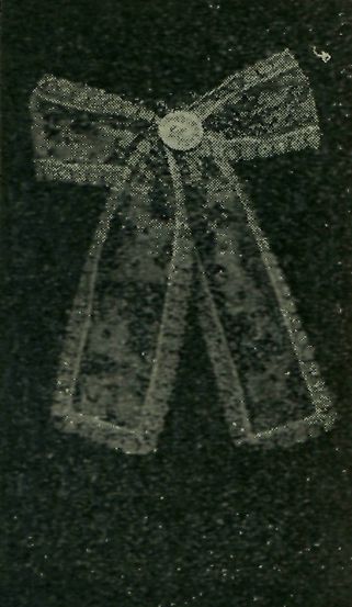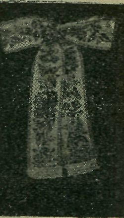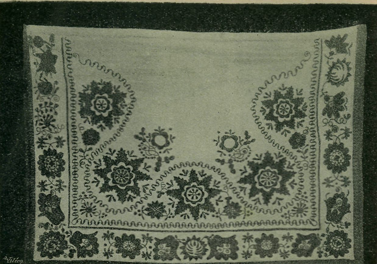 jen že na vrch, přes všechen ostatní oděv; nemá tkauic, nýbrž pod bradou sešpendluje se broží s vyšívanou mašlí. (Vyobrazení č. 12 — 13. I.—II.) Splývá od krku po ramenech dolů ani ne do polovice zad. Jest z bílého plátna a skoro všecek vyšíván. Vyšívání jde podél tří stran jednou nebo dvěma řadami rozmanitých květů, plodů, listů a jiných tvarů, v rozích pak, těmito řadami ku středu kolarinu