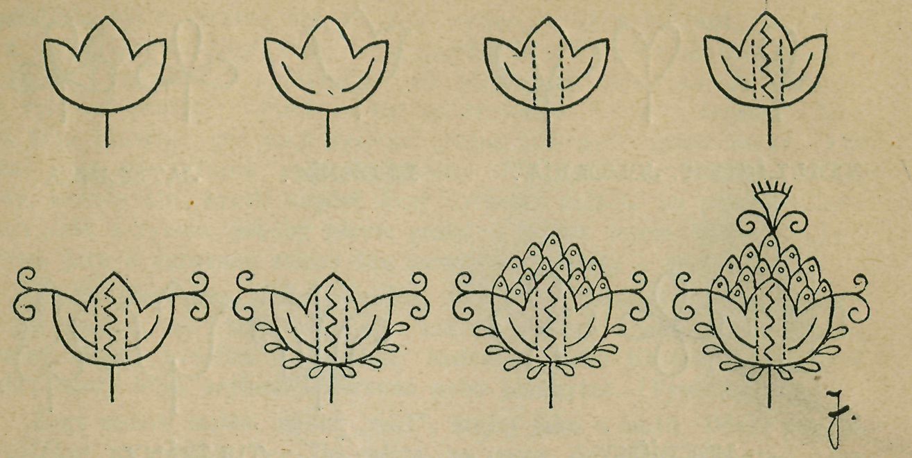 Znázorníme zde, kterou kombinací ze základního motivu některého vzniká květ nebo kytka, jak vidíme ji v našem případě už hotovou. Tak vezme-li se na příklad bedrník za základ, vyvine se z něho použitím žilek, řeťázků, sekavky, huncútů, lístků, peří a chrpy složitý květ. (Viz vyobr. č. 2.)