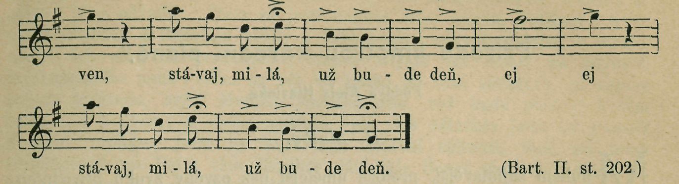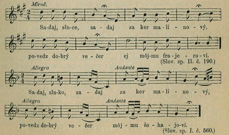V písni se mohutně a velebně líčí krása vycházejícího slunce v nádherných barvách zlaté a nachové. Jasné paprsky šlehají vzhůru po nebeské báni. — Z protivy padají noční chmury a těžké mlhoviny (ke slovům »už bude deru), nebo se tím také naznačuje vážný krok trudné, neodvratné skutečnosti: »už bude deň« — a nastane loučení.