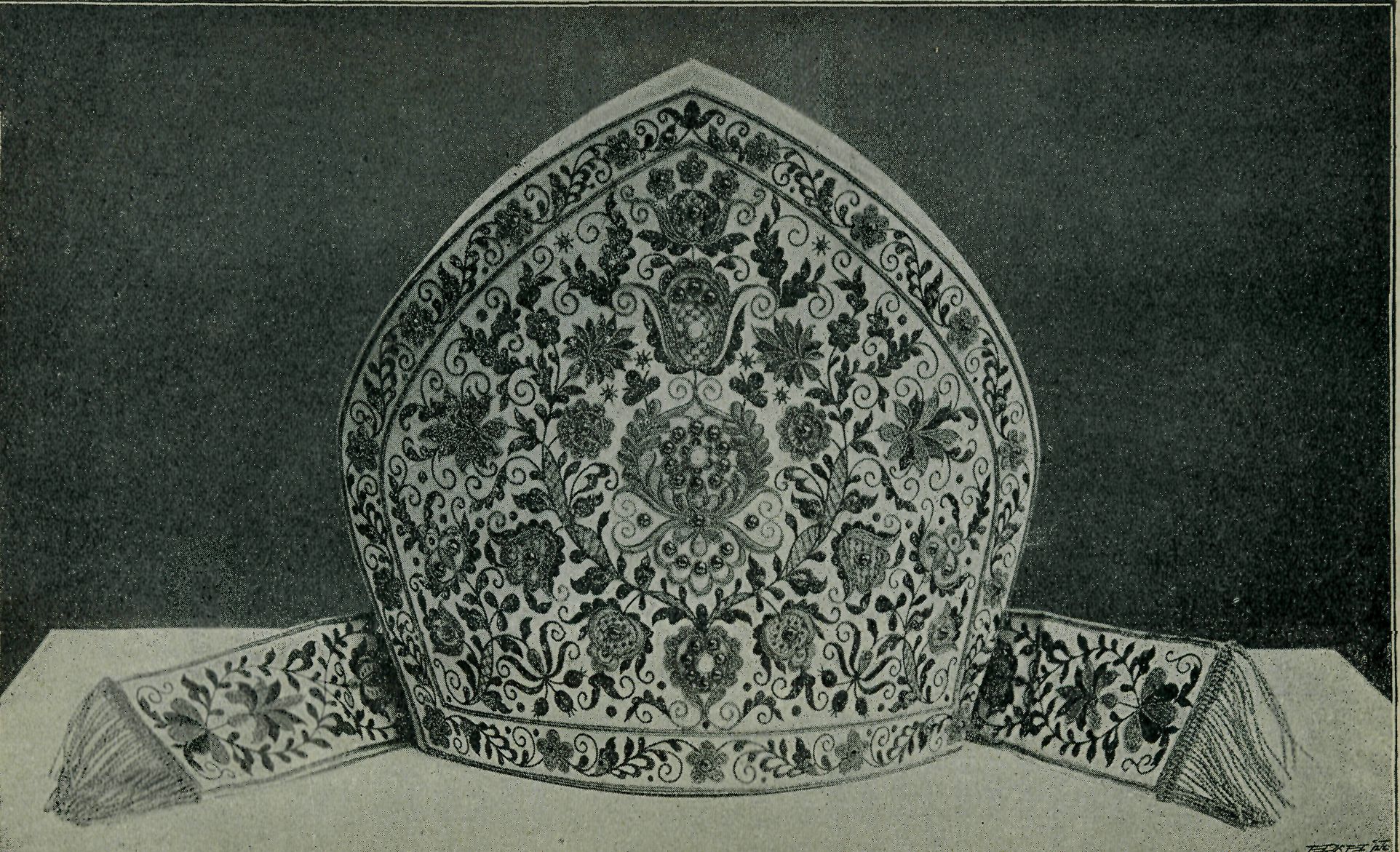 Čís." 7. Mitra s vyšívaním v národním ornamentu v slohu kasule, dle komposice prof. J. Šímy.