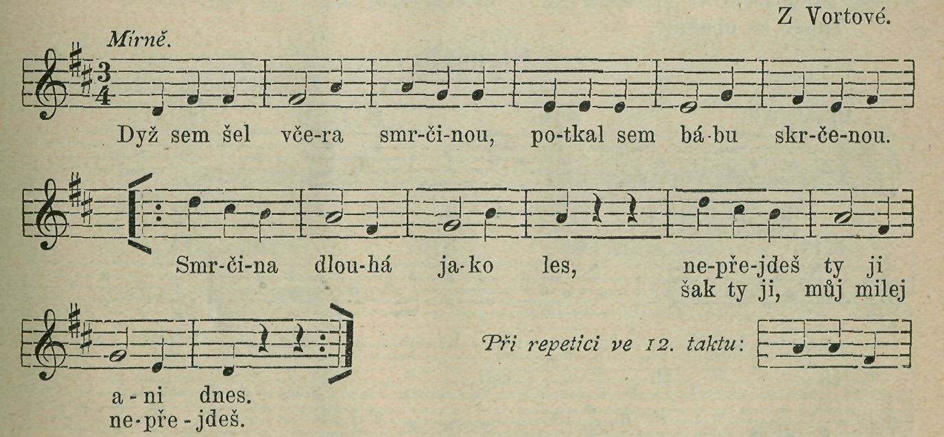 Tanec kolový. Dvojice tančí při obyčejne'm držení do kola houpavý valčík, ale na každou prvou čtvrť taktu nešoupnou nohou po zemi, nýbrž pouze ten pohyb ve vzduchu nohou opíší (asi jako při „Šmikurandě"). Při repetici se otáčejí páry jednou ? pravé straně, jednou ? levé straně. Tanec znova.