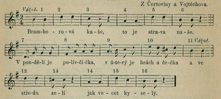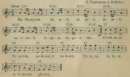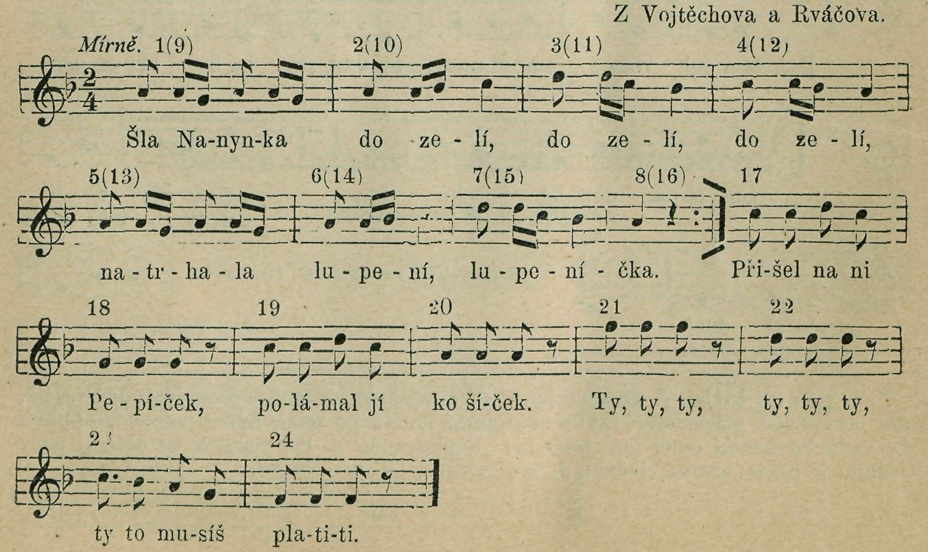 Tanec kolový. Tanečník vezme tanečnici svou pravou rukou za její levou ruku. V 1. taktu dají spojene' ruce v před, tanečník ukročí na prvou čtvrť na levo nohou levou, na druhou čtvrť přisune pravou nohu ? levé noze, při čemž se od tanečnice odvrátí obličejem. Tanečnice ukročuje na prvou čtvrť nohou pravou, na druhou čtvrť přisune levou nohu ? pravé noze V. taktu 2. dají spojené ruce v zad, tanečník ukročí na prvou čtvrť pravou nohou na pravo, na druhou čtvrť přisune levou nohu ku pravé noze a při tom se obrátí obličejem ? své tanečnici. V 3. taktu opětují tytéž pohyby jako v taktu 1., ve 4. taktu jako v taktu 2., v 5. taktu jako v taktu 1., v 6. taktu jako v taktu 2., načež v taktech 7.—10. tančí, držíce se jako obyčejně, do kola polku. V 11. až 16. taktu opakují pohyby, konané v taktu 1. až-6.