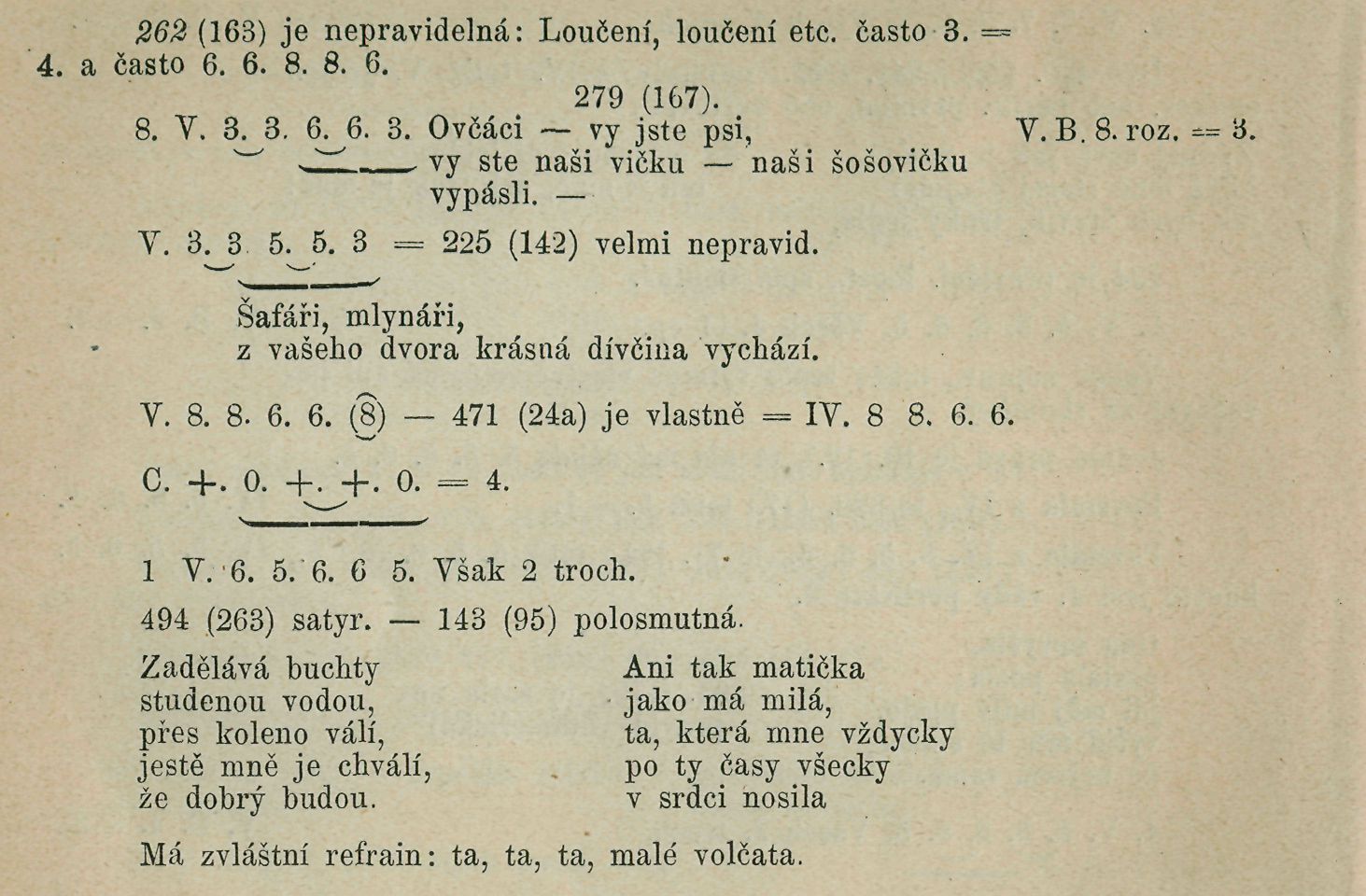 Obrazové písmo. x) I. K »písmu dětskému«, jehož ukázku přineslo 3. číslo VII. roč. G. L., dovoluji si podati malý příspěveček, tak jak mně byl sdělen děvčetem Marií Ševčíkovou. Není to však žádné »písmo dětské«, nýbrž je to kousek zábavy veřejné našeho lidu. Tak baví některý veselý muž společnost v hospodě obyčejně. Tedy ani ne při rodinných slavnostech. Hospodského za tím účelem požádá o černou tabuli a o kousek křídy, namaluje si příslušné věci, zavěsí tabuli s »figurami« na hřebík a hůlkou ukazuje na ně, zpívá: 1. To je krátký, to je dlóhý, to stolice řezací; to je basa, to só husle, to posada slepičí. Posada slepičí — basa, husle, krátký, dlóhý, to stolice řezací. 2. To je křivý, to je přímý, to je taky kolo vozný. Kolo vozný, křivý, přímý, posada slepičí; basa, husle, krátký, dlóhý; to stolice řezací. 3. To je votka, to je smotka, to je taky brama-