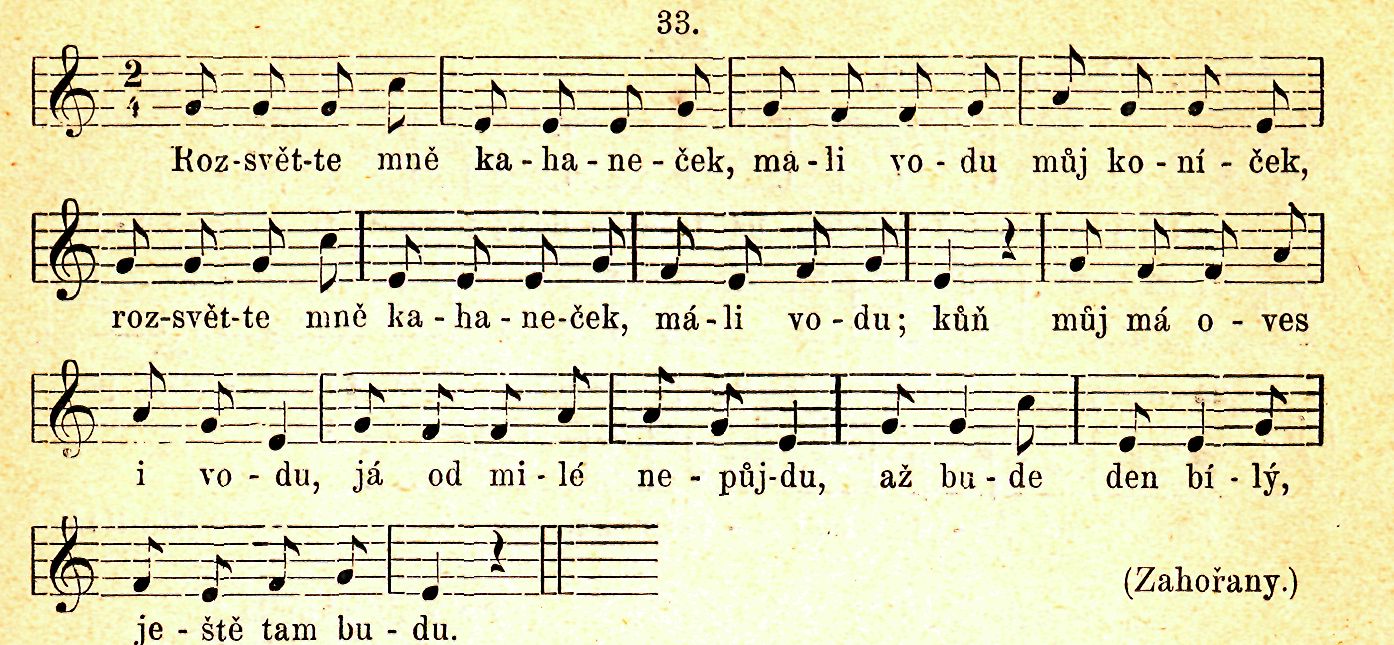 Nápěv: Erben 272. (Když jsem já k vám chodívával přes ten háječek.)