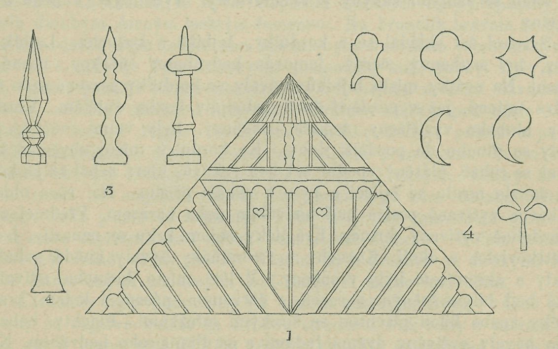 Tesařské ozdobné dílo z Kostelní Lhoty. 1. Lomenice, 3. makovičky, i. okénka. Kreslil Václav Smutný.