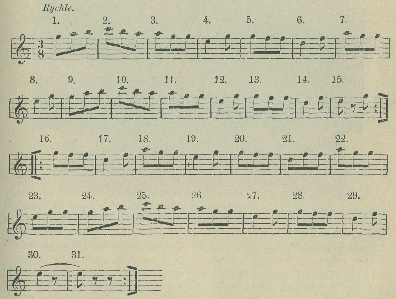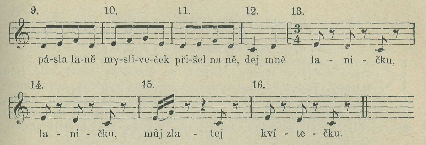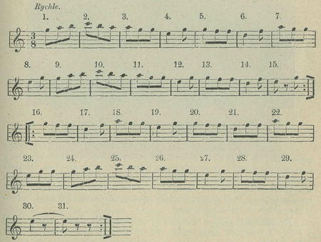 9. tančí se právě tak jako takt předešly, tanečník počne však pravou a tanečnice levou nohou. 10.—11. = 8.—9. 12 = 1. 13—16. = valčík.