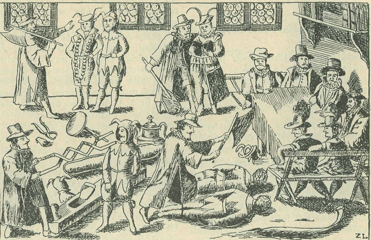 poučuje, jakého týrání a posměšků zakusil studiosus, než byl přijat do cechu universitních občanů, jak ho osekávali, štípali, hoblovali, rohy mu sráželi, kuklice bláznovské ho zbavovali atd. u přítomnosti proíessorů, vážné se dívajících na útrapy nebohých nováčků. Vše to představuje náš obrázek, vybraný z letáku ze začátku věku XVII., otištěný v známé sbírce »Monographien zur deutschen Kulturgeschichte«, chovaný v Germánském museu v Norimberce. Zbt.