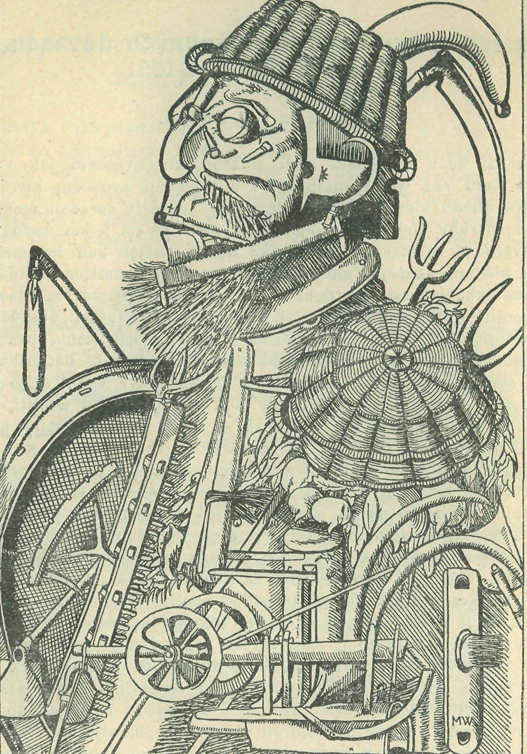 Hlava sedlákova, složená z hospodářského náčiní a plodin. Dřevorytina 16. stol. Kreslil Zd Laštovka.
