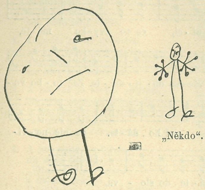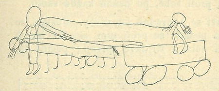 (Čís. 1.) Už je to tatínek ! Kreslí tyto postavy lidí zcela podle známé definice: »Andělé jsou pouzí duchové. Mají rozum a vůli, ale těla nemají!« Že má postava lidská jakési tělo, na to přijdou teprve později a přidělávají ke krku spodky nebo sukně. U zvířat jde to snáze. Hlava, krk, tělo (vidí je), nohy a ocas. Intelligentní dítě odpočítá koni nebo psíku a t. d. nohy a nakreslí zcela správně dvě napřed, dvě vzadu a přidělává někdy kopyta.