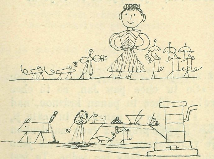 Dospívajíc pěti let má dítě již také jakousi »manýru« ve svém kreslení, jež velmi výrazně ukazuje jeho intelligenci a jeho dovednost. Ani o rok později, když se stává školákem, nepozbývá své »manýry« v tomto kreslení soukromém. Jest stále svůj. Jeví se však již rozdíly v tom, co kreslí. Jsou děti, jež se zálibou malují jen některou srěc. Moje dcerka Liduška malovala »prasátka< : veselá, smutná, závistivá, spůsobná a nezpůsobná atd.