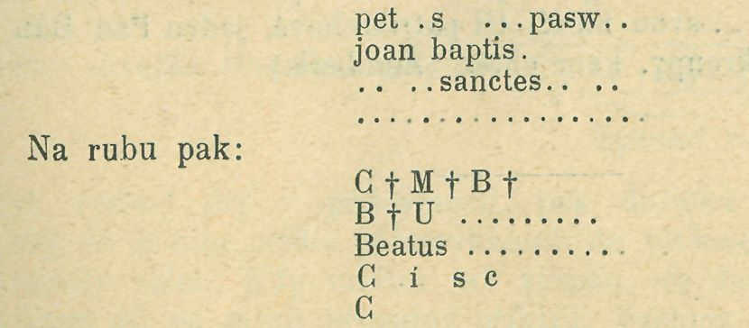 Věnujme nyní pozornost virguli neb čarovnému prutu z Křenoviček. Skládá se vlastně ze dvou prutů, zhotovených z mosazného drátu a ovinutých rovněž slabším drátem mosazným. Tyto pruty spojeny jsou na hořejším konci svém ozdobným křížkem drátěným, jehož raménka ukončena jsou drátěným jetelovým třílístkem. Křížek potažen jest pergamenovým výstřižkem z listu nějaké latinsky psané knihy modlitební, v podobě kosočtverce. Kraje lístku pergamenového olemovány jsou zelenou stužkou a skrze očka trojlístků provlečena jest opět jiná stužka. Písmo na lístku jest červené, valně již otřelé, skládá se ze 5 řádek a rozluštění jich jest nyní dosti nesnadné. Pokusil jsem se nicméně o přečtení záhadného toho nápisu, vlastně nápisů dvou, neboť pergamenový-lístek jest popsán po líci i rubu. Na lícní straně se čte: