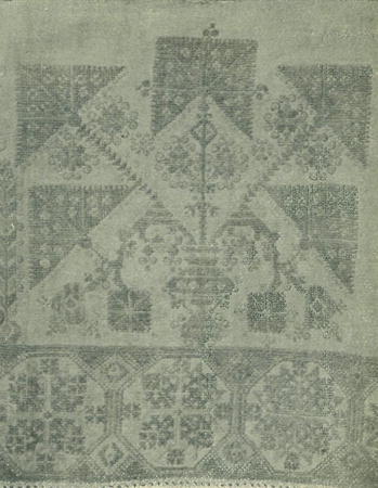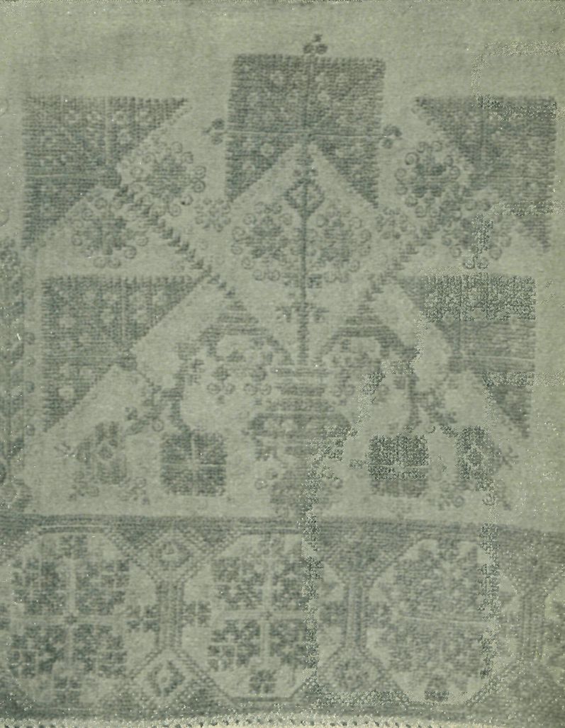 Křížkové vyšívání na plátně bylo ode dávna dílem domácím, a tam, kde tradice vedla ruku naší vyšívaéky a kde zdravý pud jí nahrazoval vědomí o zákonech komposice, docilováno neumělou tou technikou, přestávající na jednobarevném, nanejvýš frojbarevném akordu, účinků výborných. Účinky výborné a umělých variací schopné při ornamentu geometrickém, výborné, i když motivy z říše rostlinné vy-šívačce za vzor sloužily, když při jich užití, při stylisaci tvaru a převedení plochy květu v ornament se nechalavésti požadavky technickými.