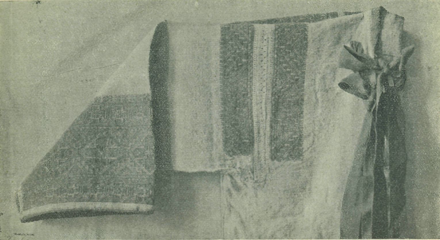 V dalším líčení studie dočítáme se rozborů esthetické hodnoty krojových součástí lidových. Paní Tyršova odvolává se při tom zvláště na směrodatný a důmyslný článek prof. J. Kouly v Českém Lidu uveřejněný. Vyšívání co ozdoba šatu souvisí úzce s jeho střihem. V primitivních periodách a u primitivních kmenů vyšívaná ozdoba přímo a bezděky vychází ze struktury oděvu, jsouc takto zároveň technicky i dekoračně motivována. Čím méně na šatu jest sešíváno, z částí různě sestřižených, čím jest řasnatější a volnější, tím méně se jeví potřeba a nutnost vyšívání. Volná draperie zná jen lem ; z částí sešívaný oděv přináší s sebou akcentování švu za motiv výzdobný ; přiléhavější oděv, sestávající z částí tvarům těla odpovídajících, dožaduje se okrasy plochy. Ornamentální vyznačování švu naskytuje se tam, kde látka podél je sešita, a tam, kde jednotlivé kusy dle potřeby tvaru těla sestřižené se stýkají. Dle toho, z jaké látky oděv jest šit, a ovšem též dle záliby dobové, ornamentace jest provedena prošíváním vytažených nití v způsobe vložky neb vyšitím vzoru po obou stranách švu. Prolamovaný šev jest přirozenou ozdobou plátna. Rozeznáváme jej na rubáších a volných hávech na starých náhrobcích z XI. a XII. stol., nalezneme jej ještě na obrázku vypodobujícím Benátčanku z doby Pavla Veronesského, jak si suší na terasse domu