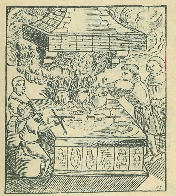 Staročeské knížky kuchařské mívají na titulním listě rozmanitá vyobrazení kuchařské práce. Obrázek na str. 328 krášlí titulní list Kuchařské knihy Bavora Rodovského z Hustiřan, vydané r. 1596. Podává jasnou představu, jak byla upravena kuchyně staročeská ve druhé polovici věku XVI., jak kuchmistr i kuchtíci připravovali krmiěky labužníkům tehdejším. Všímáme si zvláště rožňů, jimiž kuchtíci točí. Úprava jejich shoduje se úplně s popisem kuchyňského nářadí téhož, jak je popsal i zobrazil assistent V. Fabián v Českém Lidu na základě sbírek Musea království Českého.