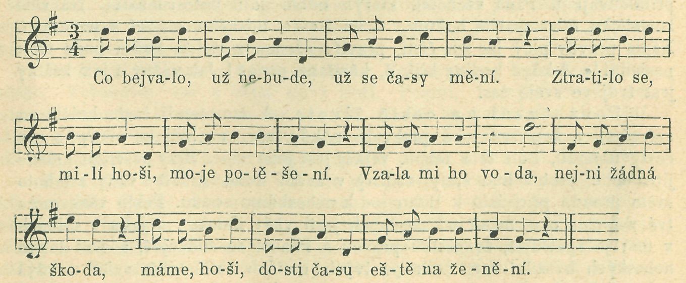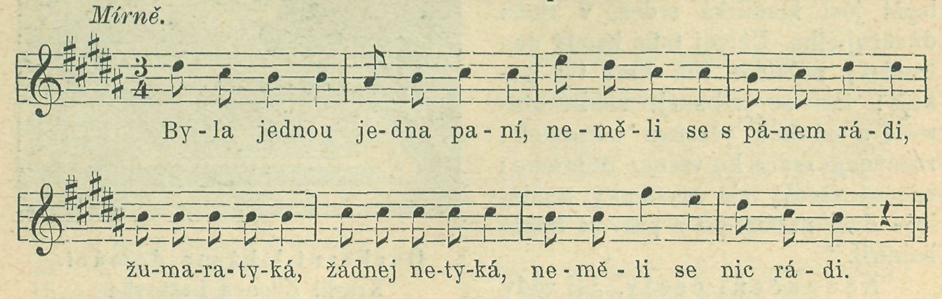 Chtělo se jí vína píti, neměl jí kdo pro něj jíti. Běž, mužíčku, běž pro něj sám a přines mi ho plnej žbán. Hned mužiček všeho nechal, do sklepa pro víno spěchal, do sklepa hned pro něj šel. Už byla plná konvice, hned pospíchal do sednice. do sednice jí ho nes. Ženuško moje rozmilá, či sou botky se špornama? Sevci na jarmark přijeli, ty boty tu zapomněli, ty boty tu nechali. Ženuško moje rozmilá, či je kabát se šňůrama, či je kabát s šňůrama? Krejčí tady dneska jeli, ty ten kabát zapomněli, kabát tady nechali.