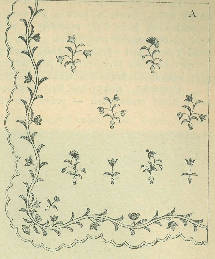 Vzor na těchto čepcích vyšit jest buď plně, nebo také květy jsou vyplněny mřížovi-nou, prolamováním (čís. 13). Ornament volen byl ke každému druhu vhodný ; pro čepce plné vybírány karafiáty, chrpy, tulipány, kvítka slunečnicová, ale vesměs menšího rozměru, že stonek, list i květ bylo snadno vypraviti technikou obšívací; květy a listy pro výplně kátrové byly tvarem větší, oblé a podlouhlé, v nichž pro mřížky bylo dosti místa. Na čepcích plných objevují se časem i ptáčkové, kterým švadleny dovedly dáti podobu určitých, rozmanitých druhů.