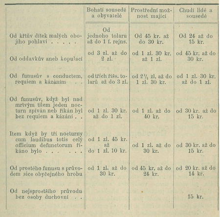 Od nejchudšího a žádné možnosti nemajícího souseda, obyvatele neb některého žebráka v špitále zůstávajícího notandum nic žádáno býti nemá, nýbrž z milosrdenství darmo vykonali má. (Dle písma ze 17. stol. Arch. arcib. Pražs. Parochialia L. Orig.)