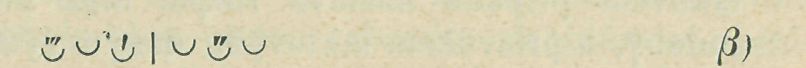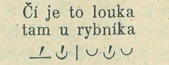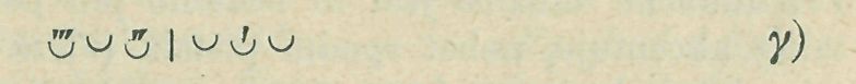 Místo tří dvojslabičných slov (skupin) vyskytují se také případy slova člyřslabičného s dvojslabičným aneb opačně: (vosy, sršáni) vyletěli na mne. Na těch Luženických (lukách). Přesně vzato musíme zase říci : >čtyřslabičné skupiny*, tedy na př. ze slova trojslabičného s jednoslabičným a naopak vytvořené : Rybička je malej (vokounek). Ta Luženská louka. V těchto př/padech jest jeden z přízvuků, připadaje dovnitř slova, valně seslaben. Číselné schéma jest: