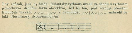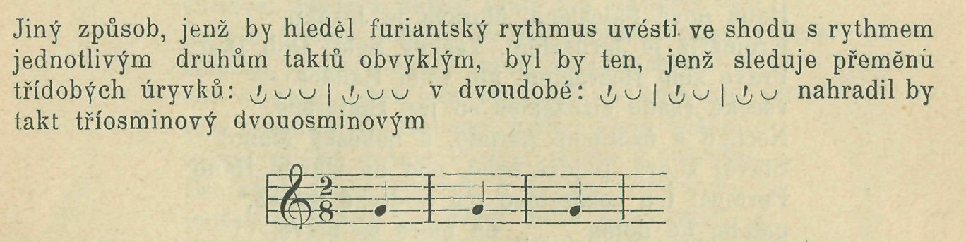 Obraťme se k důležité otázce, jak hudebně vyznačiti furiantský rythmus. Omezím-li se zase na písně »do kolečka*, jež vypisovali jsme v taktu tříosminovém, bude rythmus furiantský vyjádřen ve dvou taktech
