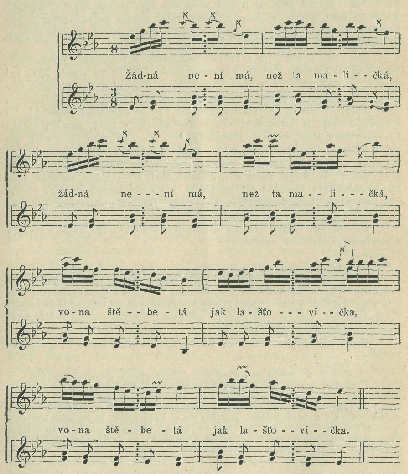 V této písni vyskytuje se rythmus furiantsky typu ji. Původně zapsal jsem píseň tuto jako tříčtvrteční volného tempa; bylať mi zpívána v soukromí. Teprve tancem i variací při muzice byl jsem upozorněn na