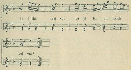 Zajímavý jest rythmický dojem těchto písní, jsou-li pouze zpívány. Zdá se nám, že máme tu co činiti s taktem dvoučtvrtečním, v jehož každém druhém taktu poslední osmina jest prodloužena (na dvojnásobnou délku). Kdyby tato každá osmá dlouhá doba se proměnila na krátkou, byla by píseň volnou polkou.