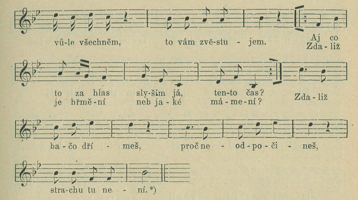2. Gloria buď chvála od lidí nemalá; narodil se nám spasitel, všeho světa vykupitel to u Betléma. Již lepší trošku, můj milý Bartošku, rozumím tomu máme jít k Betlému. Když tak báča praví, buďme tomu rádi, pospěšme k němu.