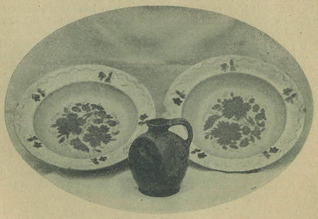 Ná d o b í nevyrábí se na Nasavrcku nikde; hliněné vozí se nejčastěji ze Svratky, kameninové (štajngutáčky) z Golč. Jeníkova. Není tedy pro okres nasavrcký ničím charakteristické, leda tím, že jako před lety, tak až podnes těší se zvláštní oblibě u lidu venkovského nádobí porculánové, zdobené malovanými růžemi, tulipány, krajinkami, nádobí hliněné pak do glasury vrytými nápisy (Nazdar! Kdo pije, ať žije! Křestní jména. Jméno a příjmem) a ornamenty (srdce, větvičky s listy). Velké hrnce na mléko poklopuje hospodyně buď na pec nebo má pro ně na záhrobní zvláštní, prkno s kolmými kolíky; často nastrčí je také jen na tyčky plotu dnem vzhůru. (Viz vyobrazení č. 31, 32.)