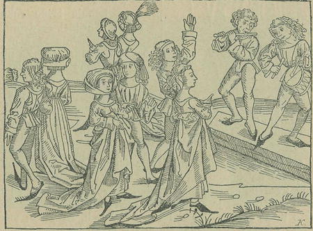 S předchozím popisem shodují se obě připojené dřevořezby. První kresbu (str. 75.) zhotovil před r. 1493 M. Wohlgemuth pro kroniku Schedelovu a odtud byla pak otiskována po rozmanitých knihách a letácích. Wohlgemuth snažil se tu, jak již bylo podotčeno, znázorniti pokutu, jaká zastihla neposlušné, náruživé tanečníky, kteří tancujíce na Štědrý večer před kostelem, vyrušovali kněze z ticha obřadů vánočních. Pištee