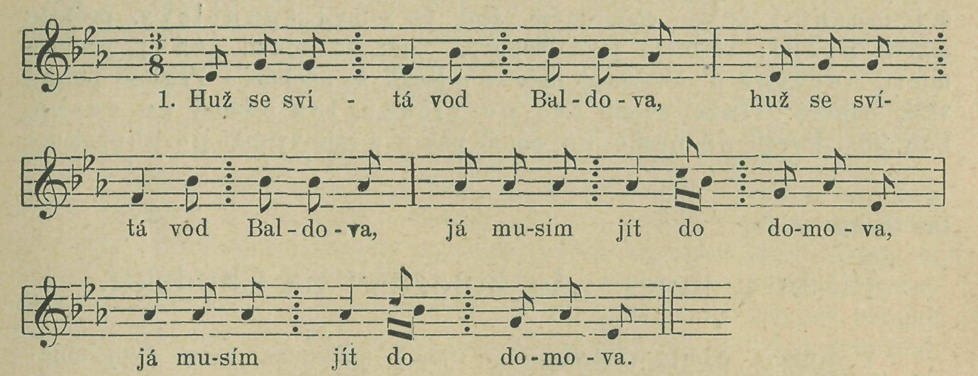 V této písni vyskytuje se uvedený rythmus výhradně sám. Jeho vznik z deklamace nejen slovné, ale i větné (Dite, muži! —¦ Dite k ženám, já bych k ní šel, — já ji nemám) jest tak jasný a zpíván bývá tak přesně a určitě, že jest píseň tato proň typickou. Vzal jsem odtud (analogicky dle furiantu) název pro tento třítaktový rylhmus: rythmus svítáníčka. Ze stanoviska harmonického zajímavá jest tato píseň stálým sklonem k tónině As dur (t. zv. Subdominante hlavní tóniny Es dur).