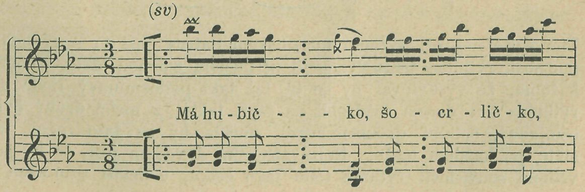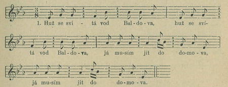 Vysoce zajímavý rythmus tento našel jsem ve dvou písních »do kolečka«. První z nich, jejíž variace bohužel jsem se nemohl dopíditi, jest: