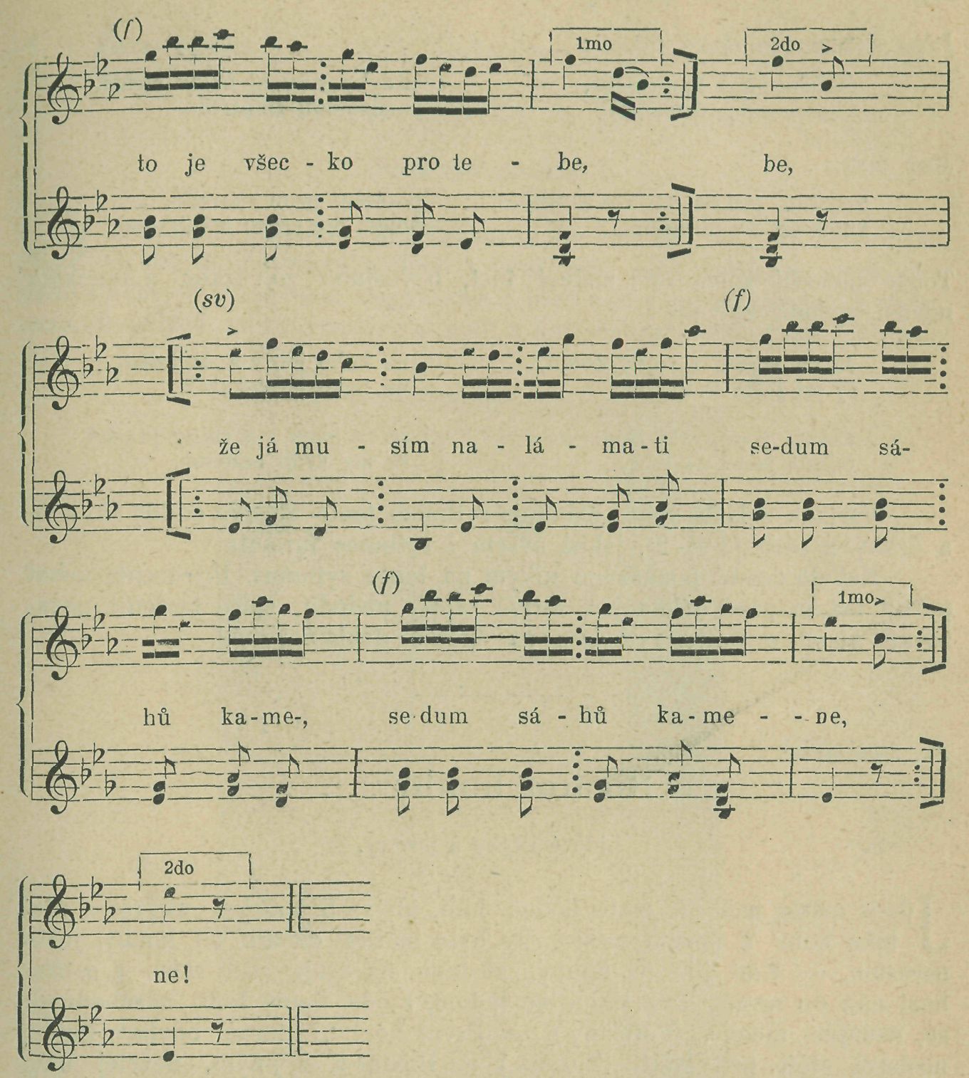 Opakování úryvku 2 f v druhém oddílu písně jest čistě hudebně motivováno a porušuje souměrnost celku jen zdánlivě. Mohlo by též odpadnouti, jak uvidíme na podobných písních sbírky Erbenovy. Jest analogické opakování furiantu v písní »Sklepej mi kováři« ke konci stati b) uvedené.