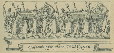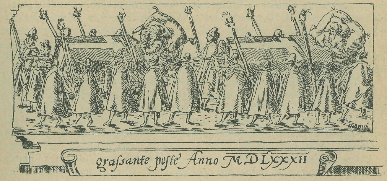 Č. 3. Pohřební průvod za rány morové v Praze r. 1582. Ze Sborníku V. Dobřenského na Strahově. Kreslil Ant. Dolenský.