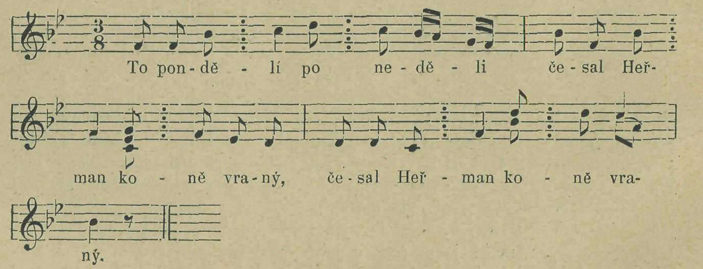 Konečně máme písně, jež trojtaktový úryvek »svítáníčka« opakují třikráte. Jest to známá ballada »To pondělí po neděli česal Heřman koně vraný«, v níž takto trojdílnost balladická, na kterou O. Hostinský upozornil **) iest provedena.