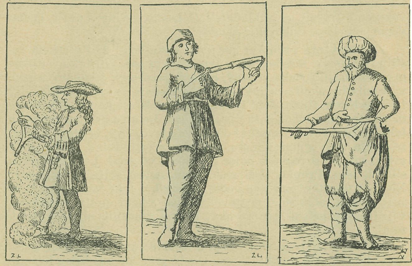 Obr. 5. Jak hledá virgalí Evropan. — Vallemont, Labaguette divinatoire 1692. Obr. 6. - 7. Jak hledá virgulí Asiat. — Vallemont, La baguette divinatoire 1692.