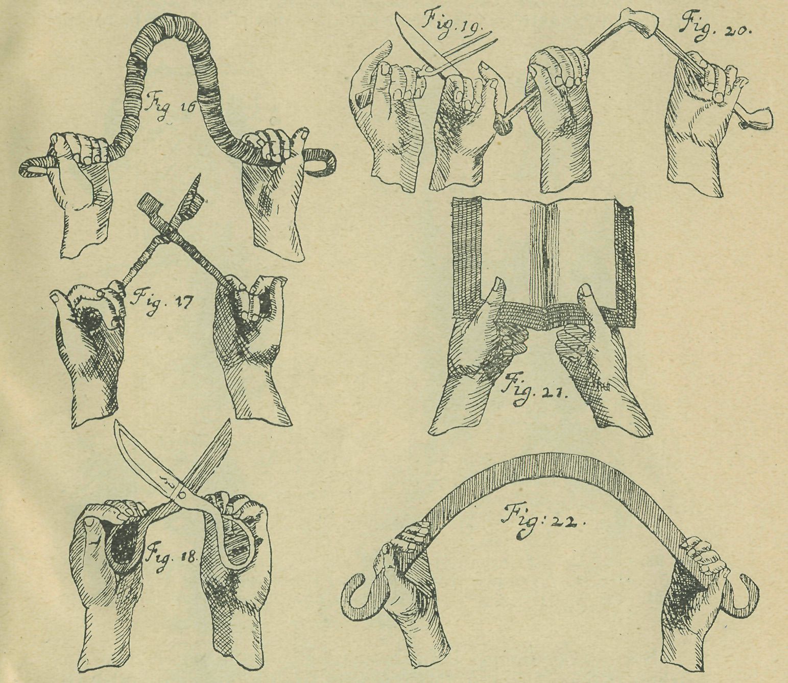 Obr. 21.—23. Žertovné náhrady proutku od vysměvačů proutkařskému kouzlu: uschlý salám, kratiknot, nůžky. — Zeidler, Pantomysterium 1700. Obr. 24.—27. Důkaz, že se sklání v rojechvěných rukou místo proutku křečovitě držená vidlička s nožem, kuřákovy lulky, otevřená kniha, rozporka řezníkova. — Zeidler, Pantomysterium 1700.